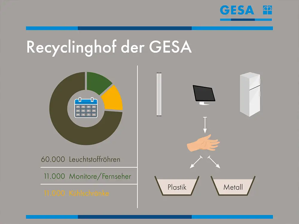 Unser Recyclinghof zählt mit über 35 Jahren zu den ältesten Projekten der GESA Gruppe und bietet Beschäftigungsmöglichkeiten für langzeitarbeitslose Menschen, wobei der Fokus auf dem Aufbau beruflicher Kompetenzen liegt. Darüber hinaus bestehen unter anderem Kooperationen mit den Städten Wuppertal und Remscheid, sodass der Recyclinghof die wichtige Funktion einer kommunalen Annahmestelle für Elektroschrott erfüllt. In diesem Rahmen werden jährlich z. B. 11.000 Kühlschränke, 11.000 Monitore sowie 60.000 Leuchtstoffröhren verarbeitet.